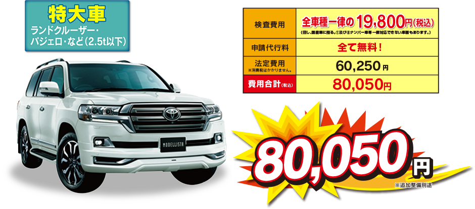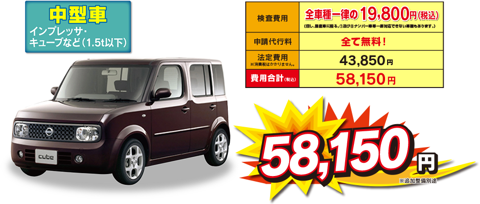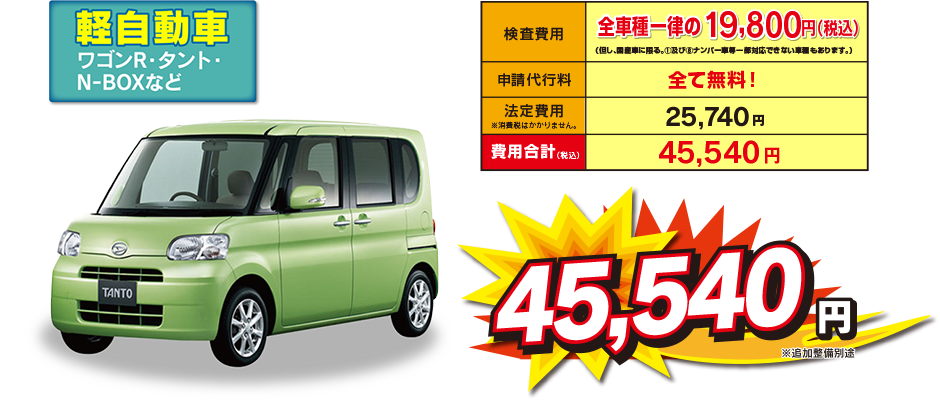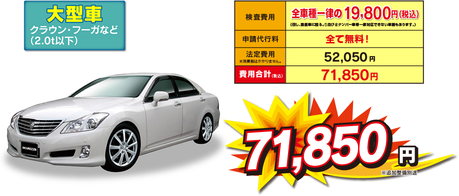 車検費用は、全車一律の19,800円(税込)。通常の車検に比べ、申請代行料を頂いておりませんので、費用を抑えることができます。